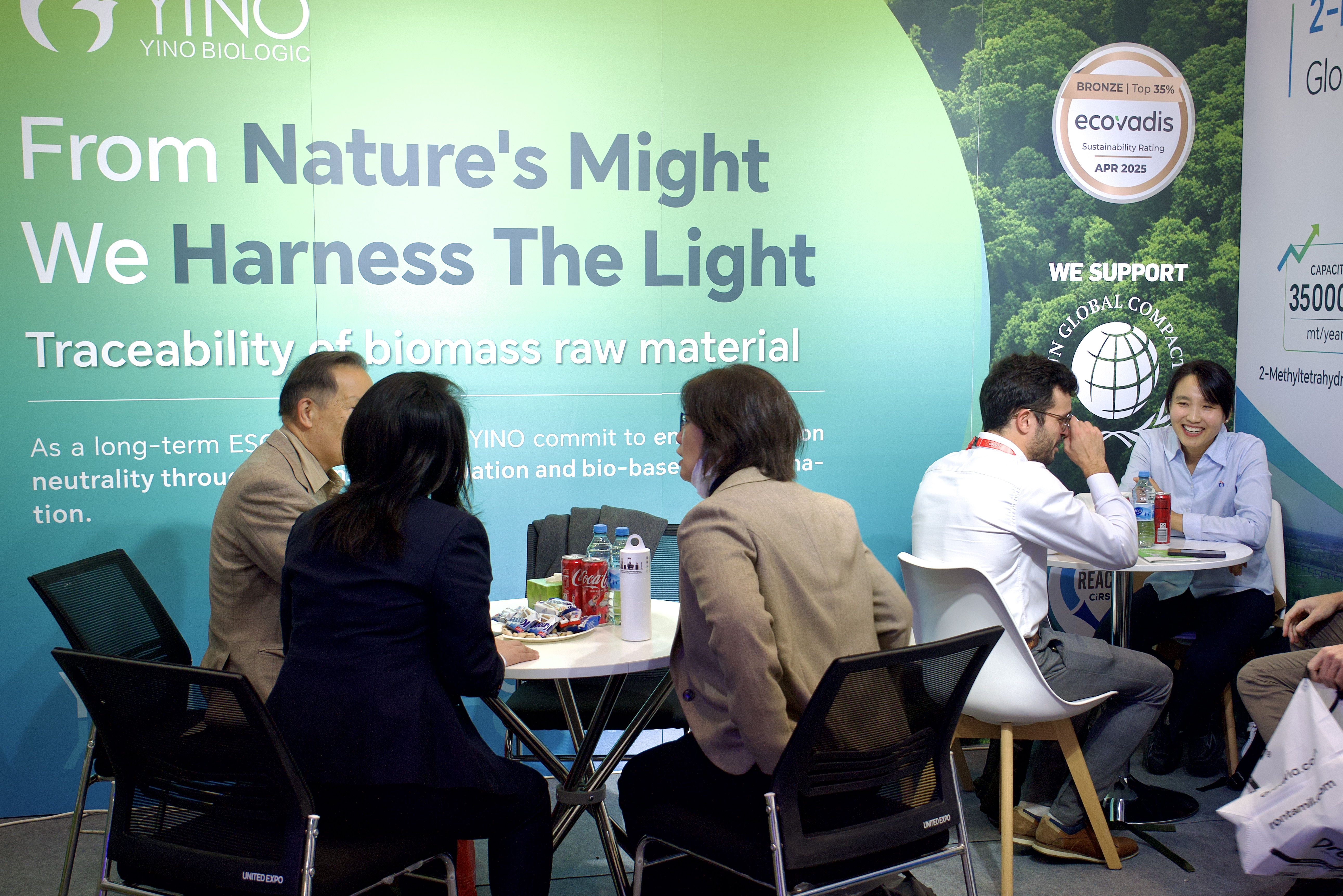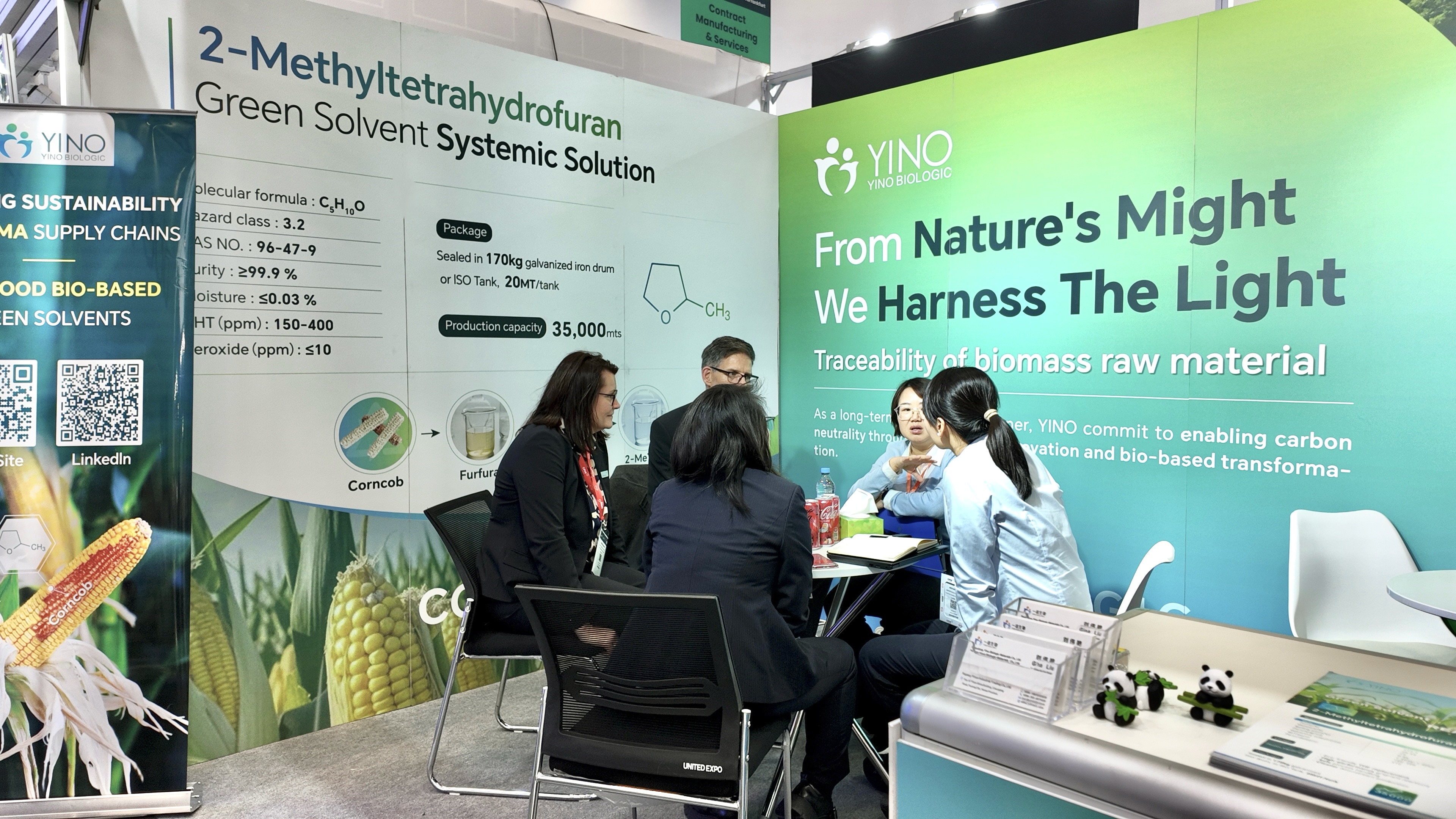In pharmaceutical manufacturing, the choice of solvents and raw materials not only determines process safety and environmental performance but also directly affects product purity and production efficiency. YINO Biologic utilizes non-food biomass corncob as its primary raw material, achieving carbon reduction and resource efficiency from the very beginning. The company has established a green supply chain covering the entire process from raw materials to end products. At the exhibition, YINO highlighted several high-performance sustainable products, including 2-Methyltetrahydrofuran (2-MeTHF) — a green solvent for active pharmaceutical ingredient (API) synthesis that effectively replaces traditional THF, significantly reduces volatile organic compound emissions, and enhances both reaction safety and efficiency; 3,4-Dihydro-2H-Pyran (DHP) — a key intermediate for high-end protecting groups and fine chemical synthesis; and δ-Valerolactone (δ-VL) — a next-generation high-purity cyclic ester widely used in pharmaceutical excipients and polymer development. These innovations fully demonstrate YINO’s strength in green chemistry and sustainable material development.